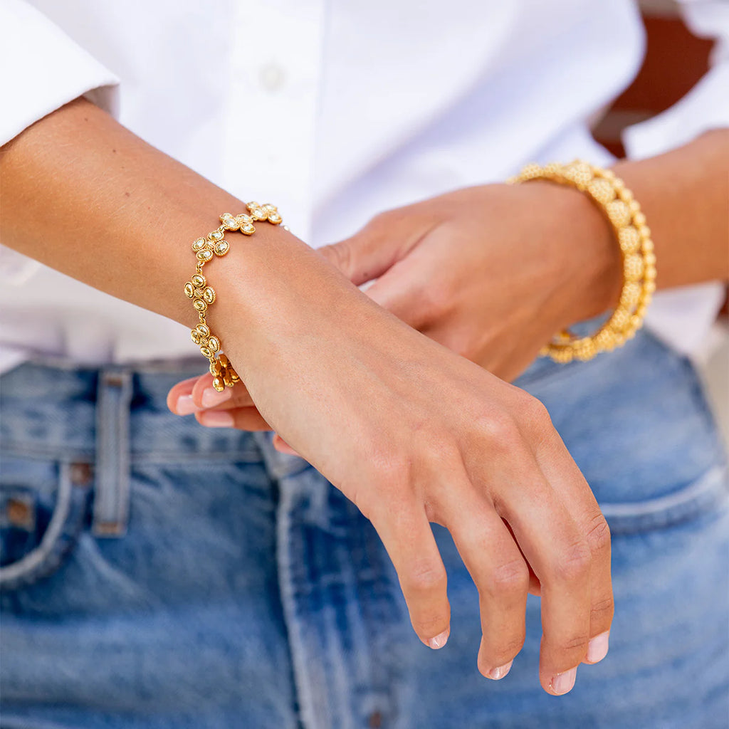 Better than finding a lucky clover, this stunning bracelet is like stumbling upon a field full of them, with gleaming golden clovers united in linear fashion. This go-to piece layers beautifully in a bracelet stack.